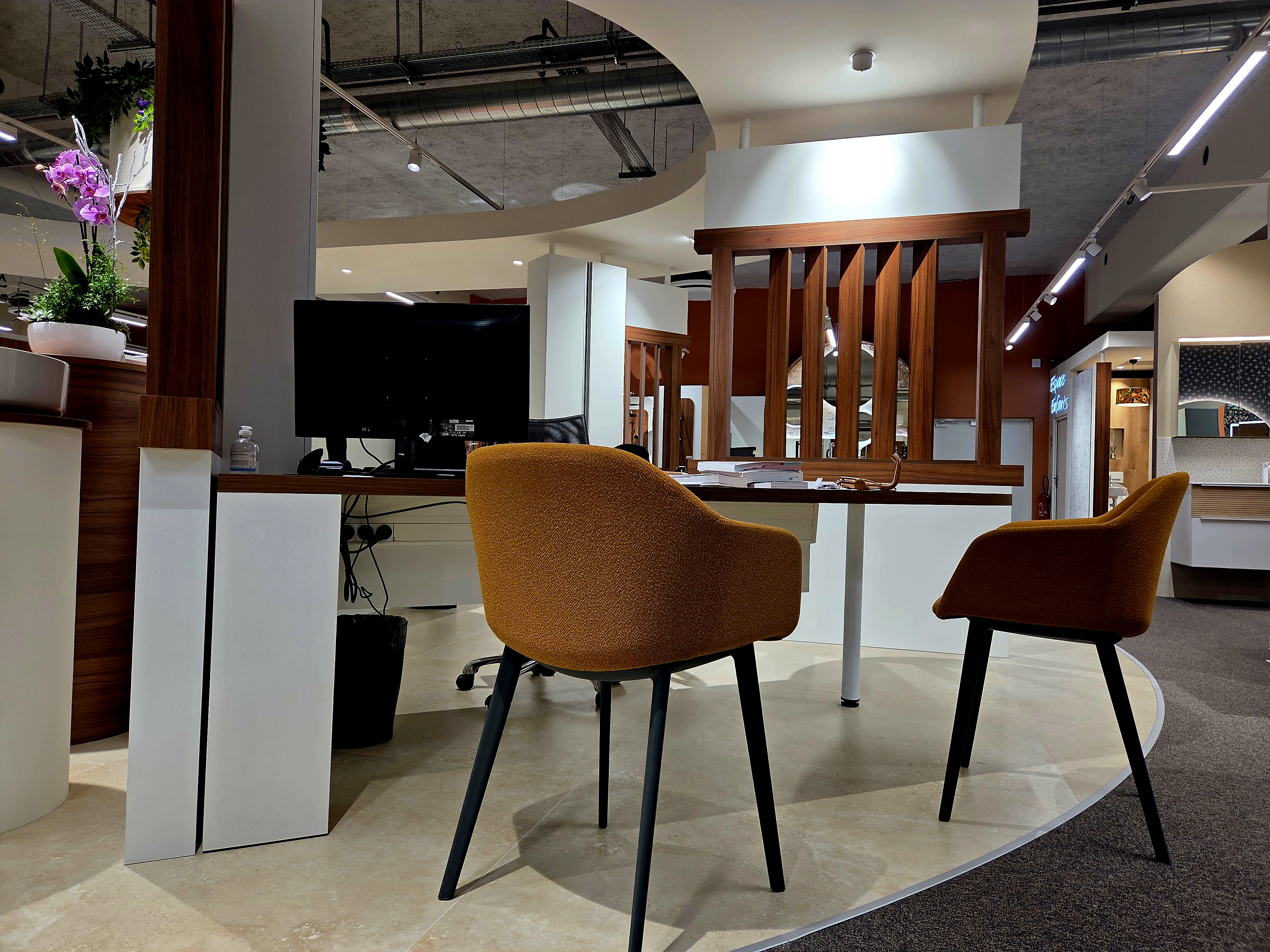 Au cœur de la composition, l’olivier, installé devant l’ensemble bureau et magnifié par la coupole du plafond qui magnifie l’espace accueil client, s’impose comme un symbole d’élégance naturelle et de pérennité.